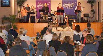 I showed up one morning and played "Little Man," since it seemed the most "spiritual" to me. It went over well. This guy came up to me afterwards and said he was surprised that I could really play guitar since the pastor had invited lots over the years that could well, not. Not sure if I sat in with the band that morning but I was invited back, which I ultimately did. It was great fun as I just sat in the corner and played guitar – no singing ;o) I liked that. Eventually I started showing up for Wednesday rehearsals and Sunday mornings. At one point one of the band members took exception that I was playing here but went to a different church [but not Sunday mornings]. I said fine. That was that.Until, that is, I said fine. I was blissfully sidelined, not a care in the world, and not singing. Wasn't too long that I was asked to co-lead the band. It was a pretty rocky band: drums, flute, bass, cello, keyboard, electric guitar, me and the Adamas, and a bunch of singers. It was pretty cool, until the "co" decided to quit, which left me, now the leader of the band for 4 years or so.