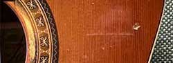 About four years later - 2021. Sound starts coming and going. Pull plug out and in, seems to work for while. Guess what? I changed the battery. It worked, for a while, and again would come and go. Okay, it's not the battery. I go through the same process above, pulling all the electronics out and testing volts, continuity, wiggling wires, checking solder joints, resoldered some. Everything seemed fine EXCEPT something fell from the shelf above while working and put a gash in the top as evidenced below. Put it all back together [I say that glibbly but it's not all that easy of a task]. Seemed to work for a while but the coming and going returned – and I was caught on video on the 2021 annual fall recording saying, "I took it all apart." The only thing left was the actual jack the cord plugged into, so I got a new one. Wasn't too hard, just had to unbolt the jack and pull the wire out the soundhole, remove the old one, solder the new one, replace and done. It was the jack.